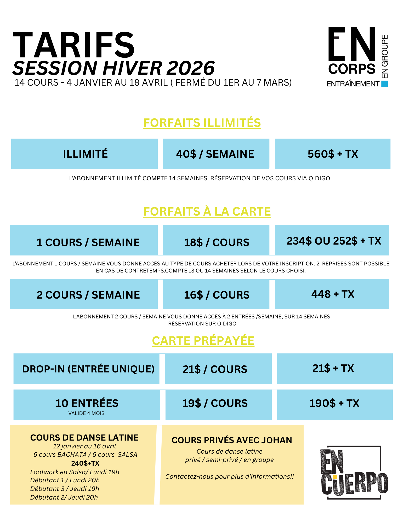 Pour choisir la formule qui te convient, prends connaissance de l’horaire des activités et communique avec moi.